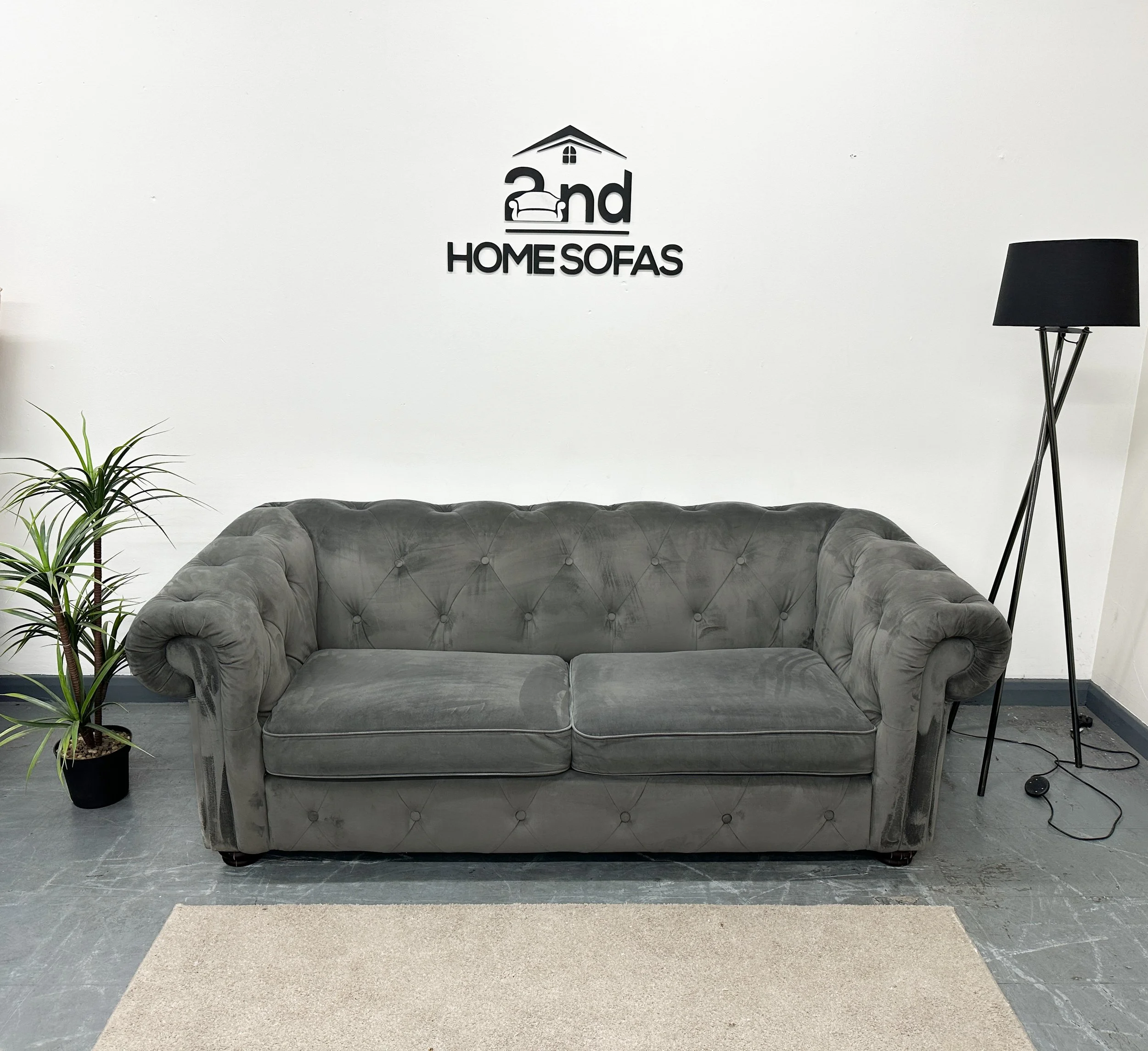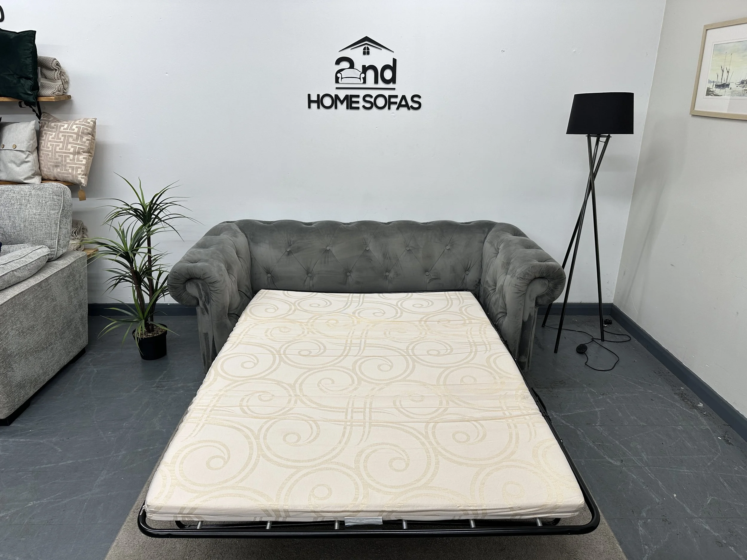 A fantastic 2 seat DFS sofa bed. This sofa bed has been upholstered in a lovely grey velvet fabric. This sofa has foam seat cushions and fibre filled back and bolster cushions. This sofa has a metal action pullout double bed.