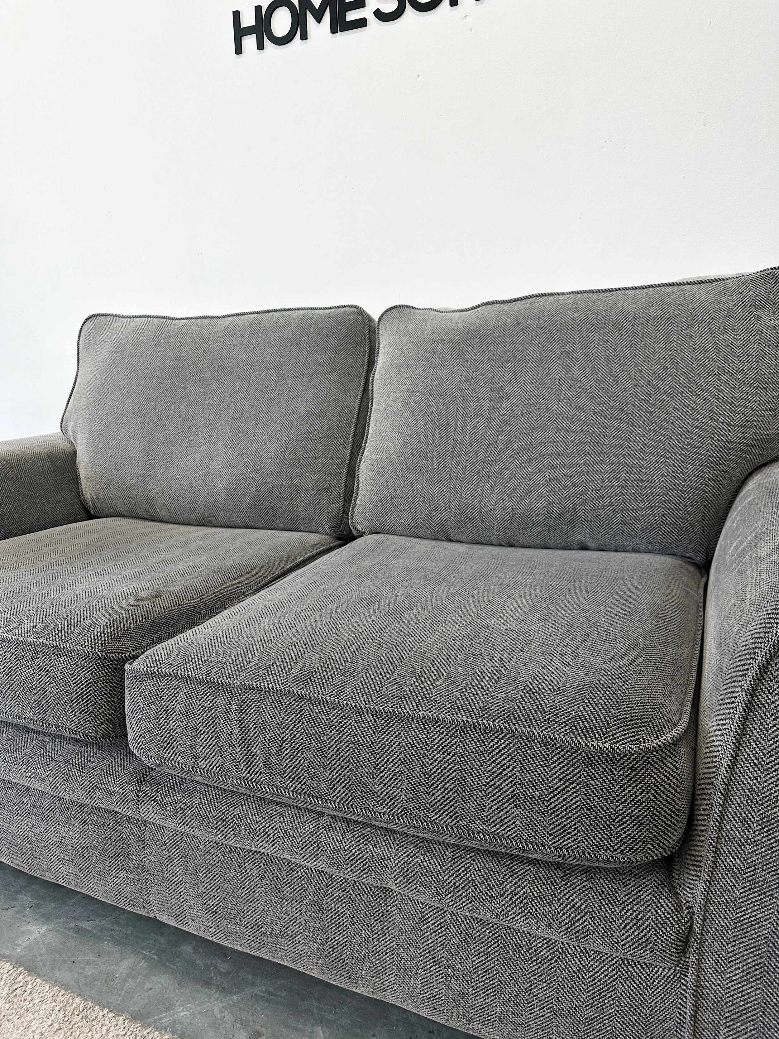 A stylish Sofology 2 seat sofa. This sofa has been upholstered in a mid grey fabric. The sofa is made with foam seat cushions and fibre filled back cushions.