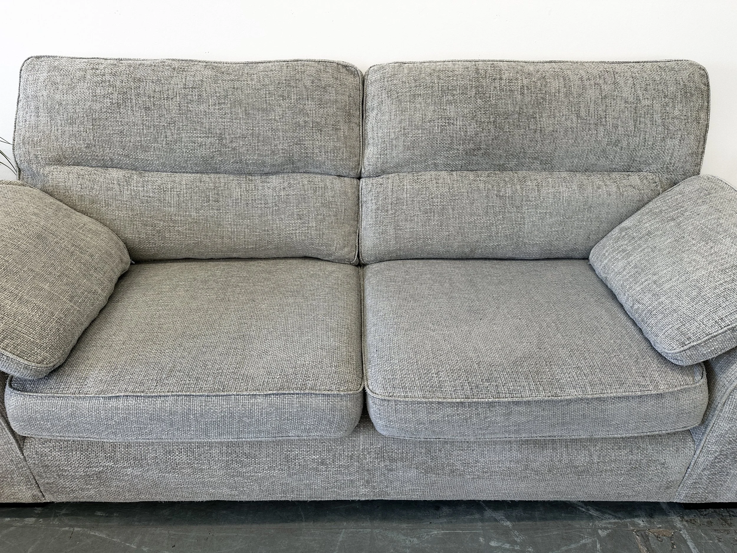 A beautiful NEXT large sofa from the ‘Stanford’ high back range. This sofa has been upholstered in a their light grey chunky chenille fabric. This sofa has foam seat cushions and fibre filled back and side cushions.