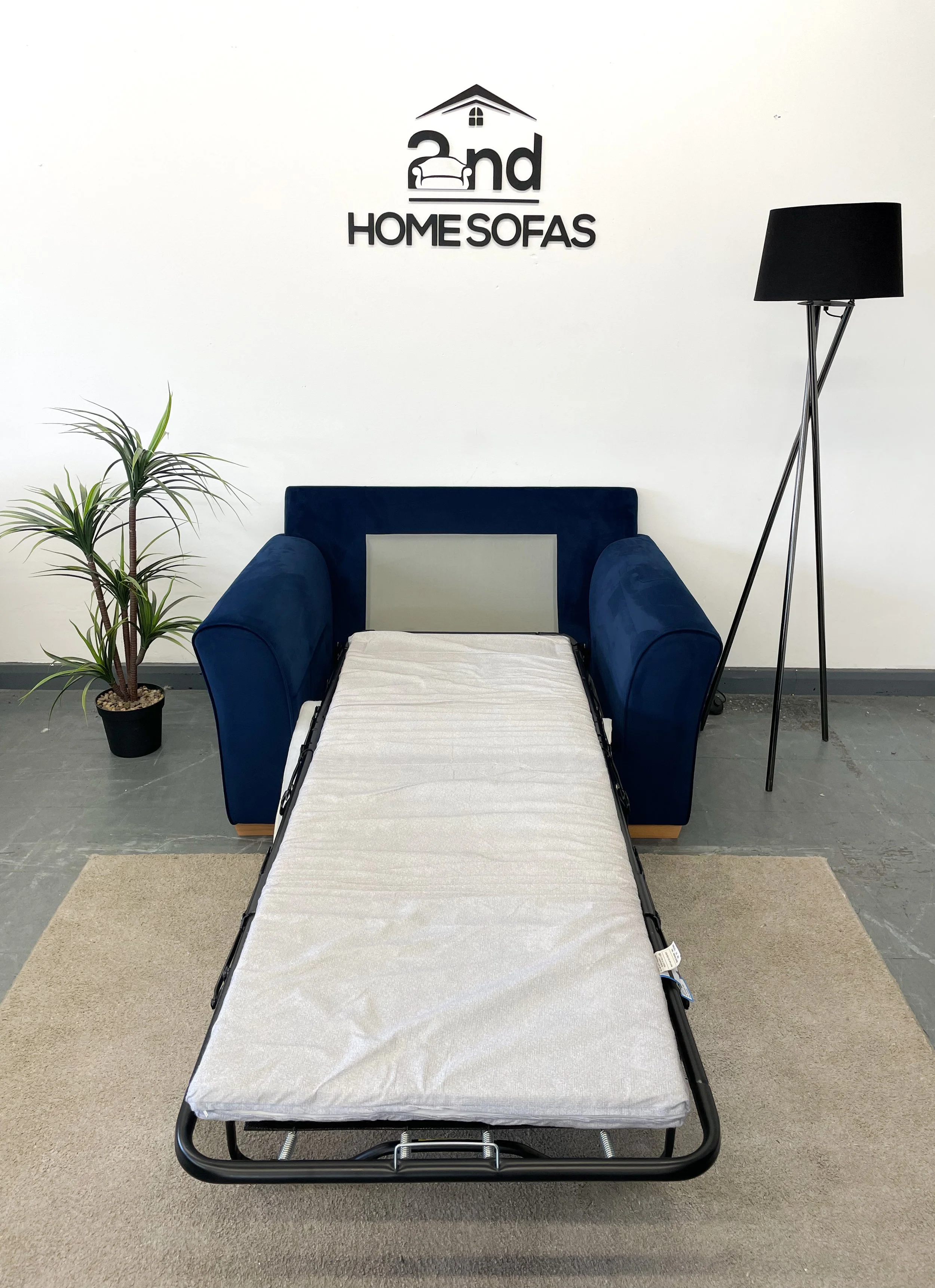 A fantastic cuddle chair sofa bed from NEXT. This chair has been upholstered in a gorgeous navy plush velvet. This chair has a foam seat cushion and fibre filled back cushion. The sofa has a metal action pull out single bed which is great for any over night guests.