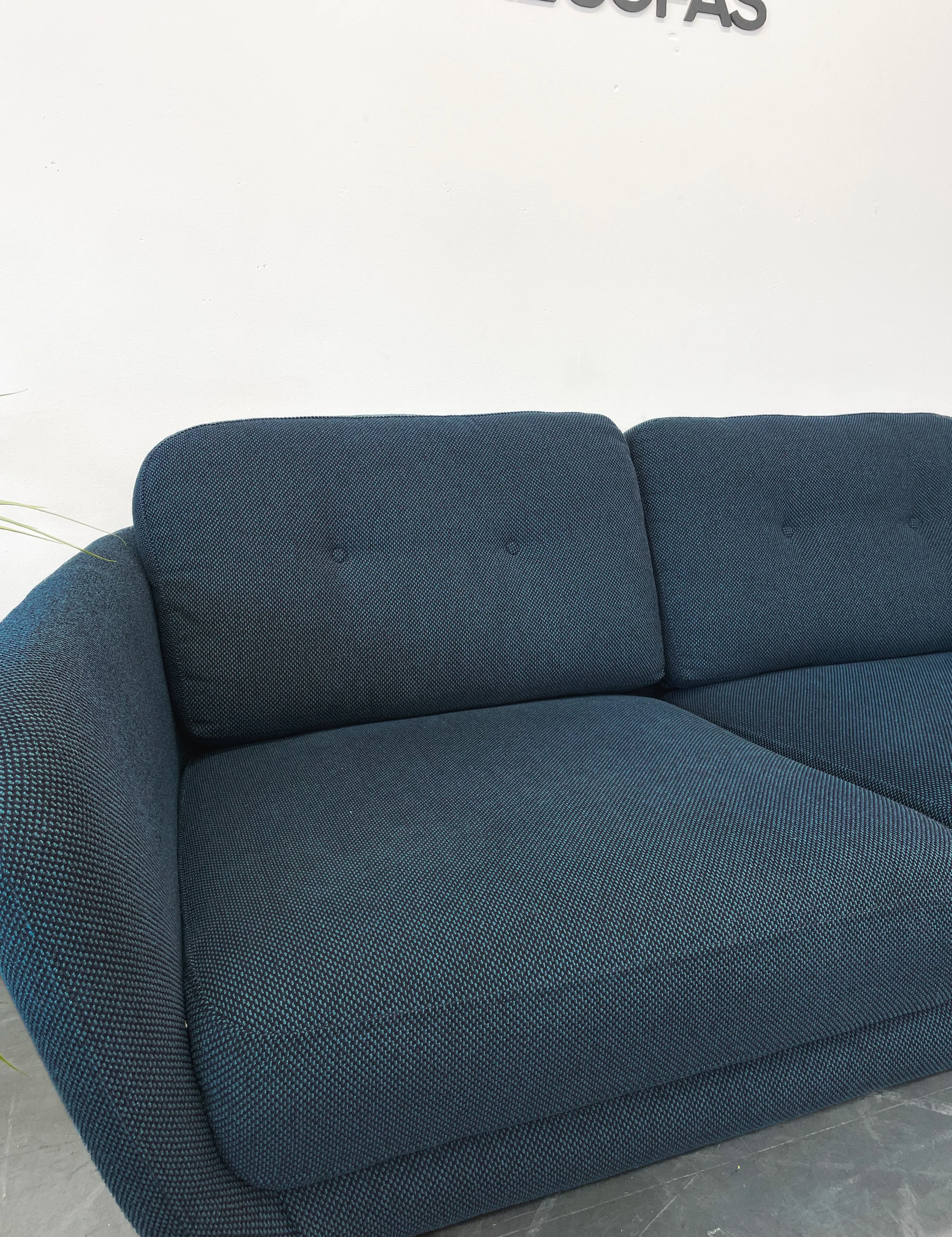 A stylish 2 seat sofa from John Lewis. This sofa has been upholstered in a dark teal fabric. This sofa has foam seat cushions and fibre filled back cushions.